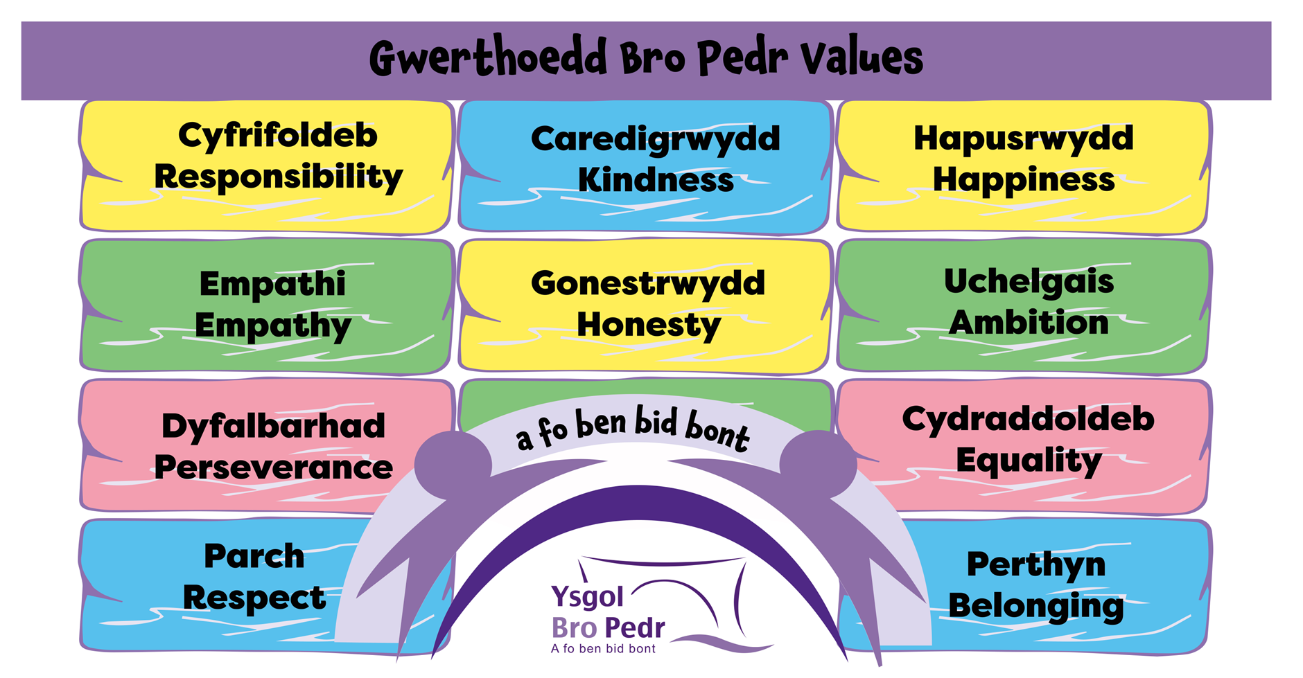 Mae gweledigaeth Ysgol Bro Pedr wedi’i seilio ar werthoedd craidd yr ysgol sef:
